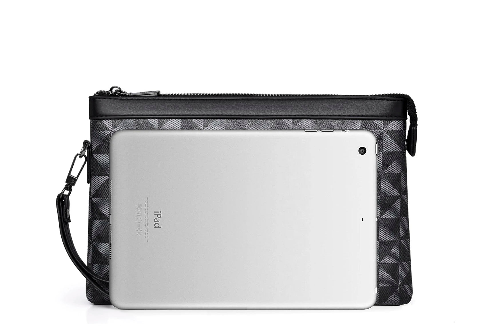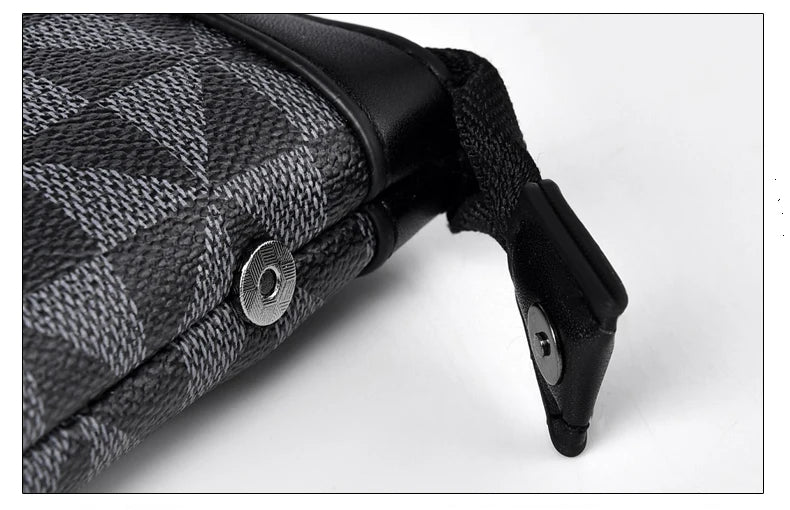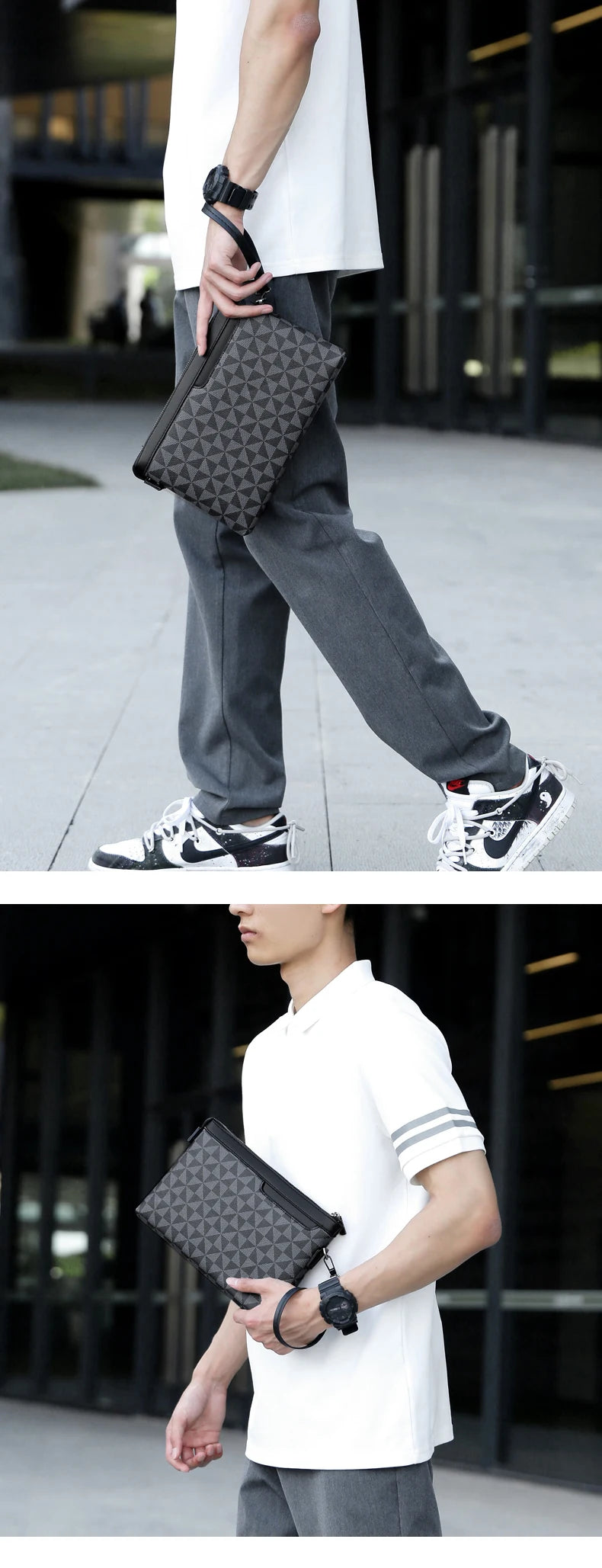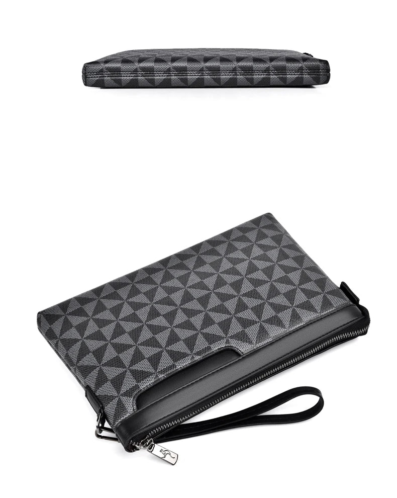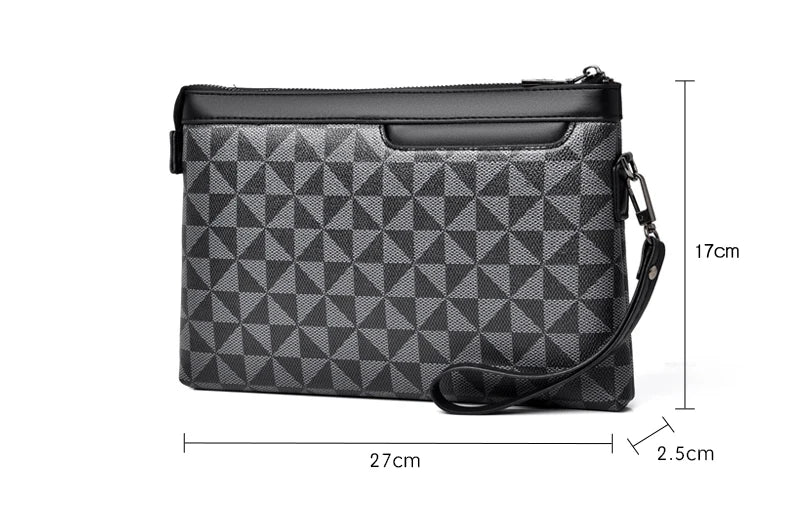 Refine your everyday look with this sophisticated men's clutch bag, designed for style-savvy individuals who seek a blend of practicality and modern aesthetics. This accessory features an eye-catching geometric pattern in deep charcoal and black, adding a touch of contemporary flair.