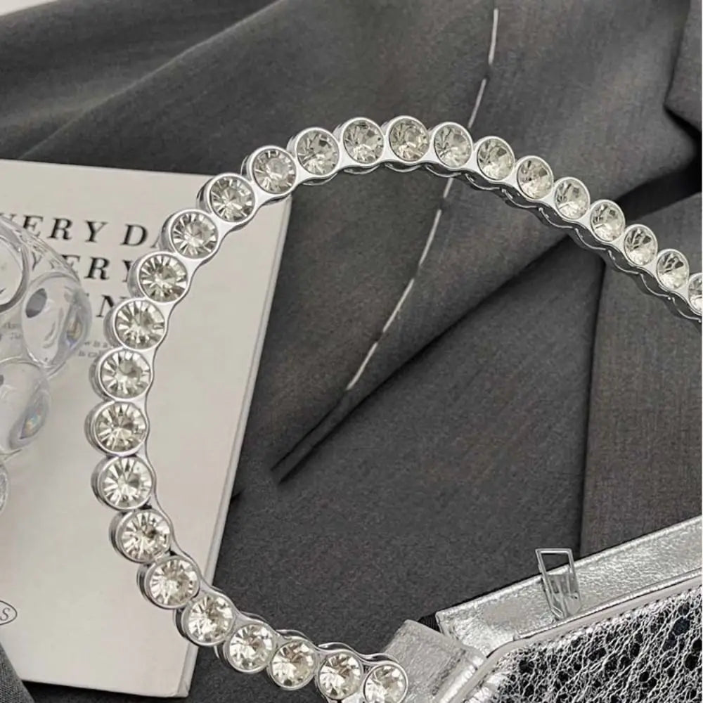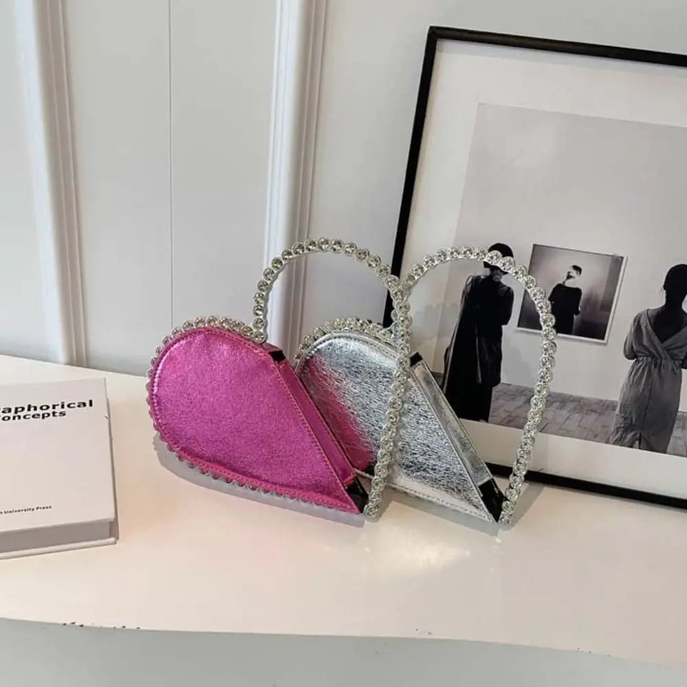 Step out in style with our Sabelle. This unique, heart-shaped bag is adorned with dazzling rhinestones, giving it a luxurious and glamorous appeal. The bag features a sleek, shimmering metallic finish in striking shades, perfect for adding a pop of color or sparkle to any evening outfit
