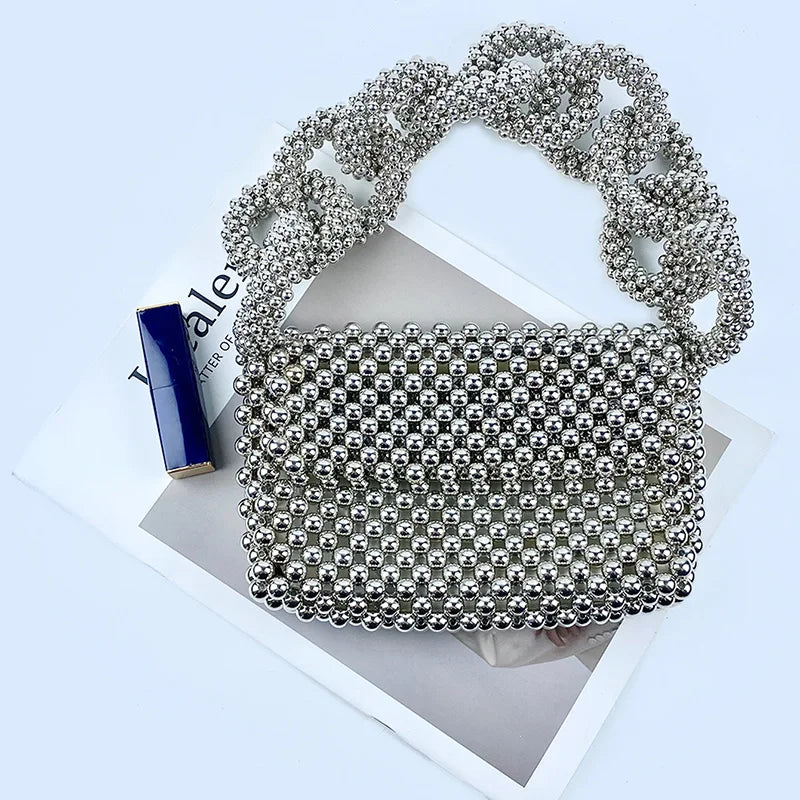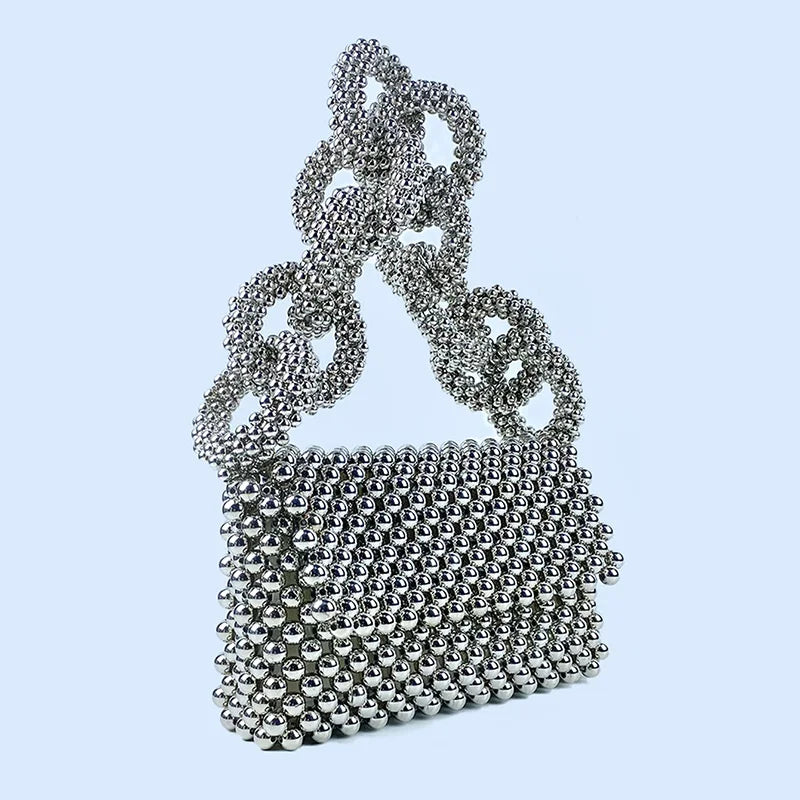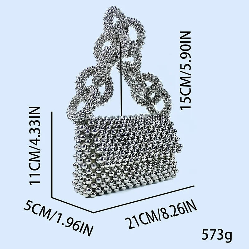 The eye-catching Kombè is meticulously crafted with intricate beadwork throughout, creating a shimmering texture that adds elegance to any outfit. The unique chain-link handle is made from large, beaded loops, giving it a modern twist on classic handbag designs. Perfect for evening events, special occasions, or as a statement piece for daily wear, this bag is both stylish and functional. Compact yet spacious enough for essentials, it’s an exquisite piece for the fashion-forward individual.